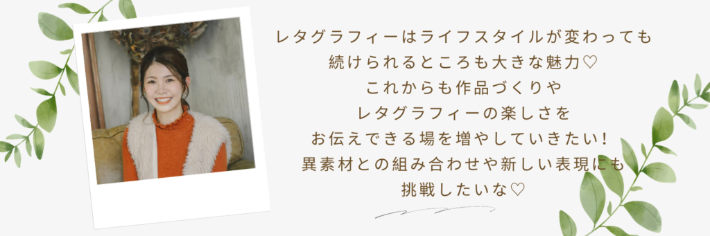 また、レタグラフィーは日常のさまざまな場面に取り入れることができるので、思い立ったときにおしゃれなアイテムを気軽に作れるようになったのも嬉しいポイントです。ちょっとしたものでも、自分の手で形にできる楽しさを感じています。