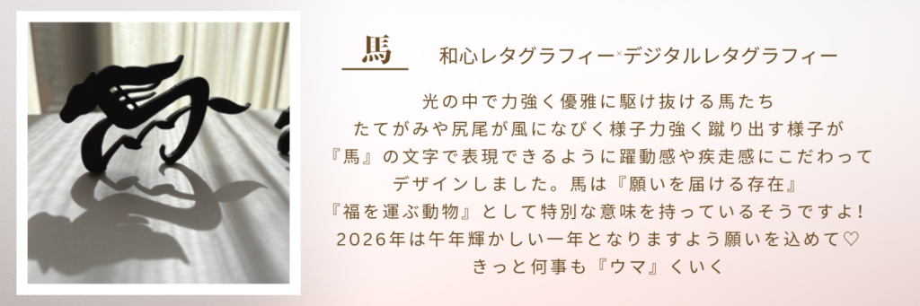 最初アクリルミラーの彫刻で作ったデザインだったのですが、和文字シリーズの馬にしてみたいと思って、そこからまた文字をつないだり変更したり。
